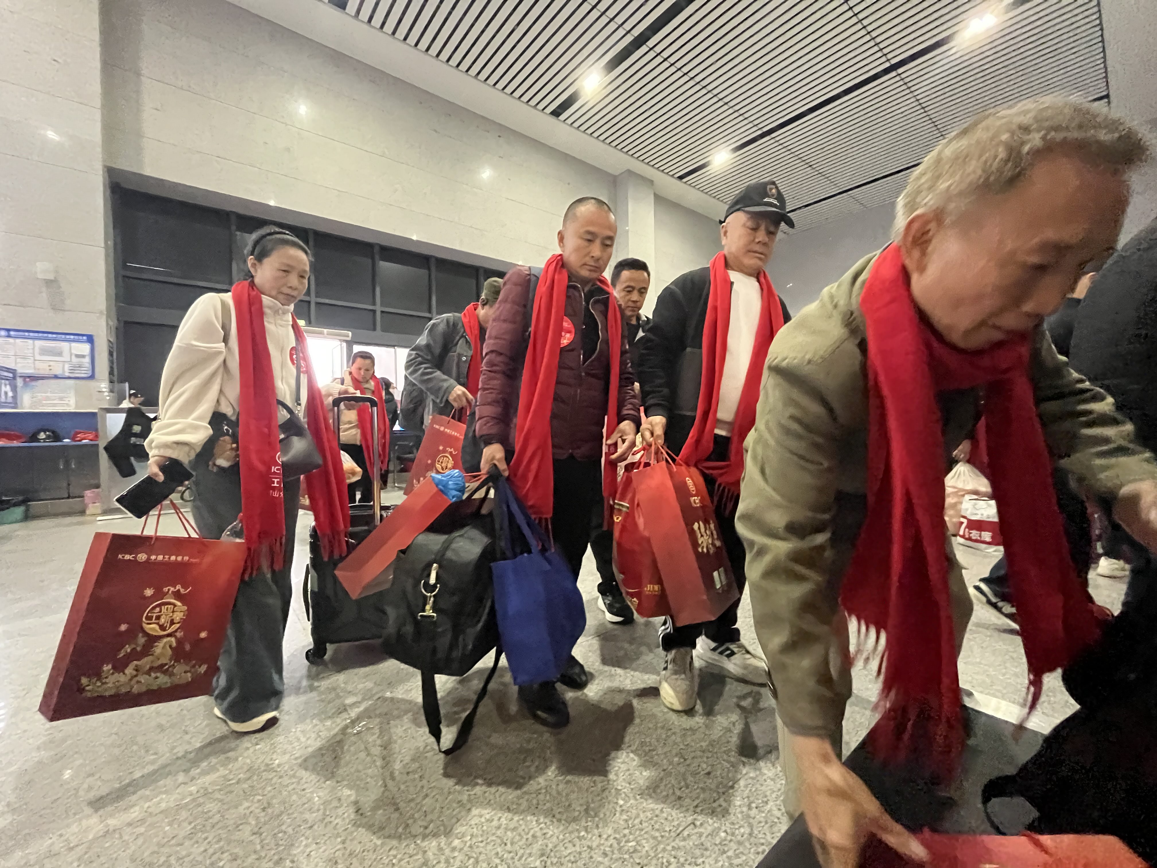 3月2日,农历正月十四。四川眉山东站,340名工友接过伴手礼,他们将乘坐D1809列车,前往广州。