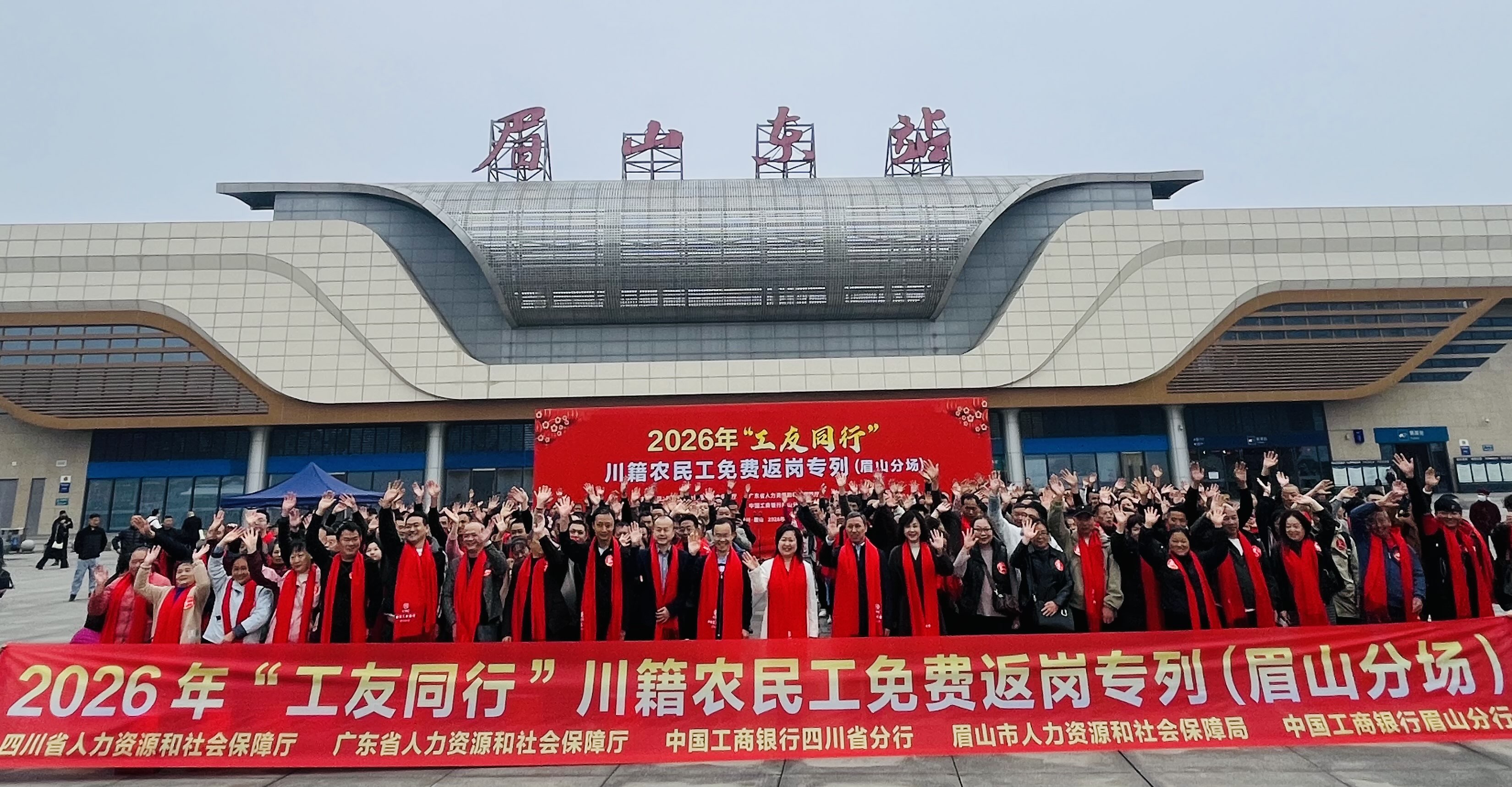 图为眉山东站,乘坐免费专列的工友排队返岗。