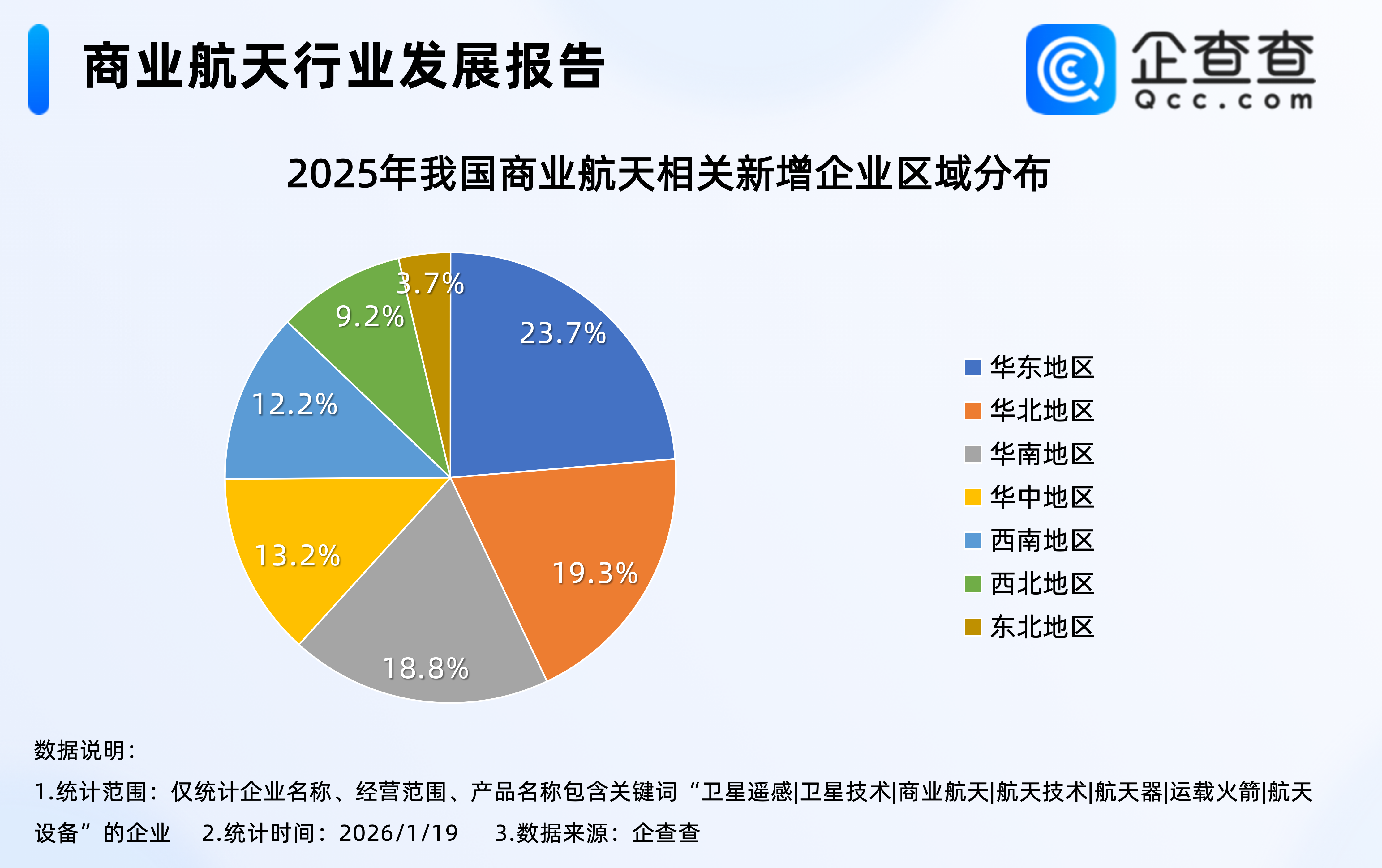 企查查数据显示,近十年,我国商业航天相关企业注册量基本逐年增加,其中2020年注册量同比大幅增加97.9%至0.72万家,达近十年注册量增速峰值,2025年全年,我国累计注册2.57万家商业航天相关企业,同比增加55.1%,创近十年相关企业注册量新高。2.从区域分布来看:华北仅次于华东地区,占比19.3%